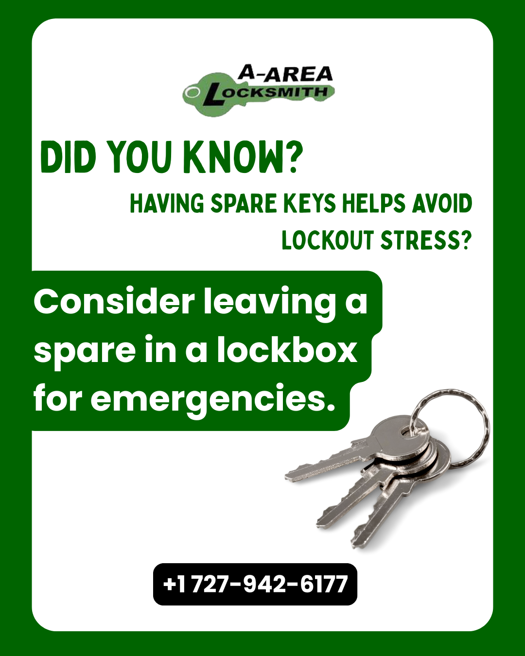 Getting locked out is frustrating, stressful, and often expensive — but it’s also preventable. One of the simplest ways to avoid lockout emergencies is by having a spare key stored in a secure, accessible location. A-Area Locksmith recommends using a lockbox system to keep your spare key safe and ready when you need it most.